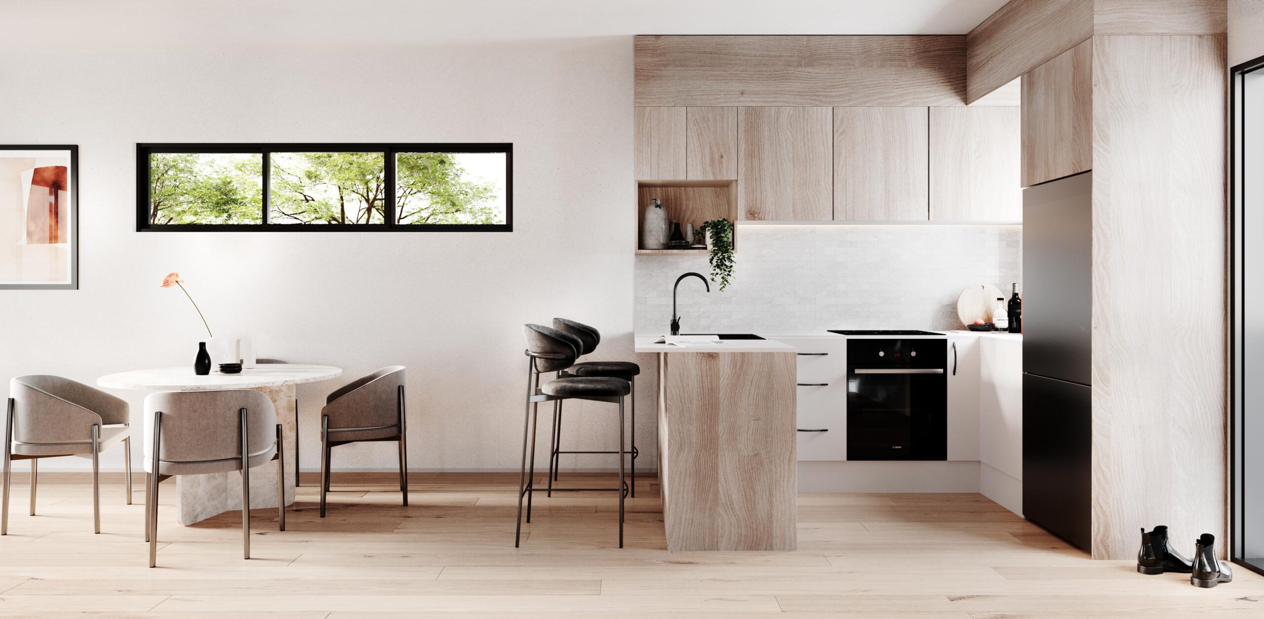 Contemporary and elegantly designed, the open plan kitchen features an engineered stone benchtop, Bosch appliances, tiled splashback, and soft close drawers. Buyers can choose between natural light wood cabinetry or a sharp dark wood cabinetry alternative.